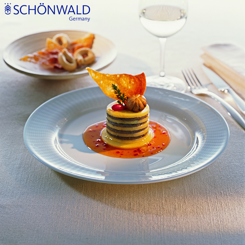 德国的SCHONWALD的陶瓷器皿定位于高端的星级酒店和高端餐厅会所,以及对生活和器皿细节有高追求的人士。 德国Schonwald瓷器用目前世界最先进的陶瓷自动化生产设备,用特制的干粉冲压到钢制模具而成型,同时在经过1000度烧制使胚体定型。保证了产品手感的细腻性,器形外观的规整性和尺寸的统一性! 德国Schonwald瓷器在经过1000度胚体素烧的基础上,通过自动化施釉设备,让瓷釉更均匀吸收到胚体上,再通过1400度的高温烧制。高要求的生产流程保证了产品釉面的耐磨性和均匀性,不惧刀叉的长久切磨! 在秉承德意志民族的严谨精神,恪守生产流程的规范化和对新技术应用的基础上,德国Schonwald瓷器在硬度上一直引领行业标准。高硬度瓷器保证了餐饮器皿日常使用的效率和长久的生命力,长远上为顾客节约成本。